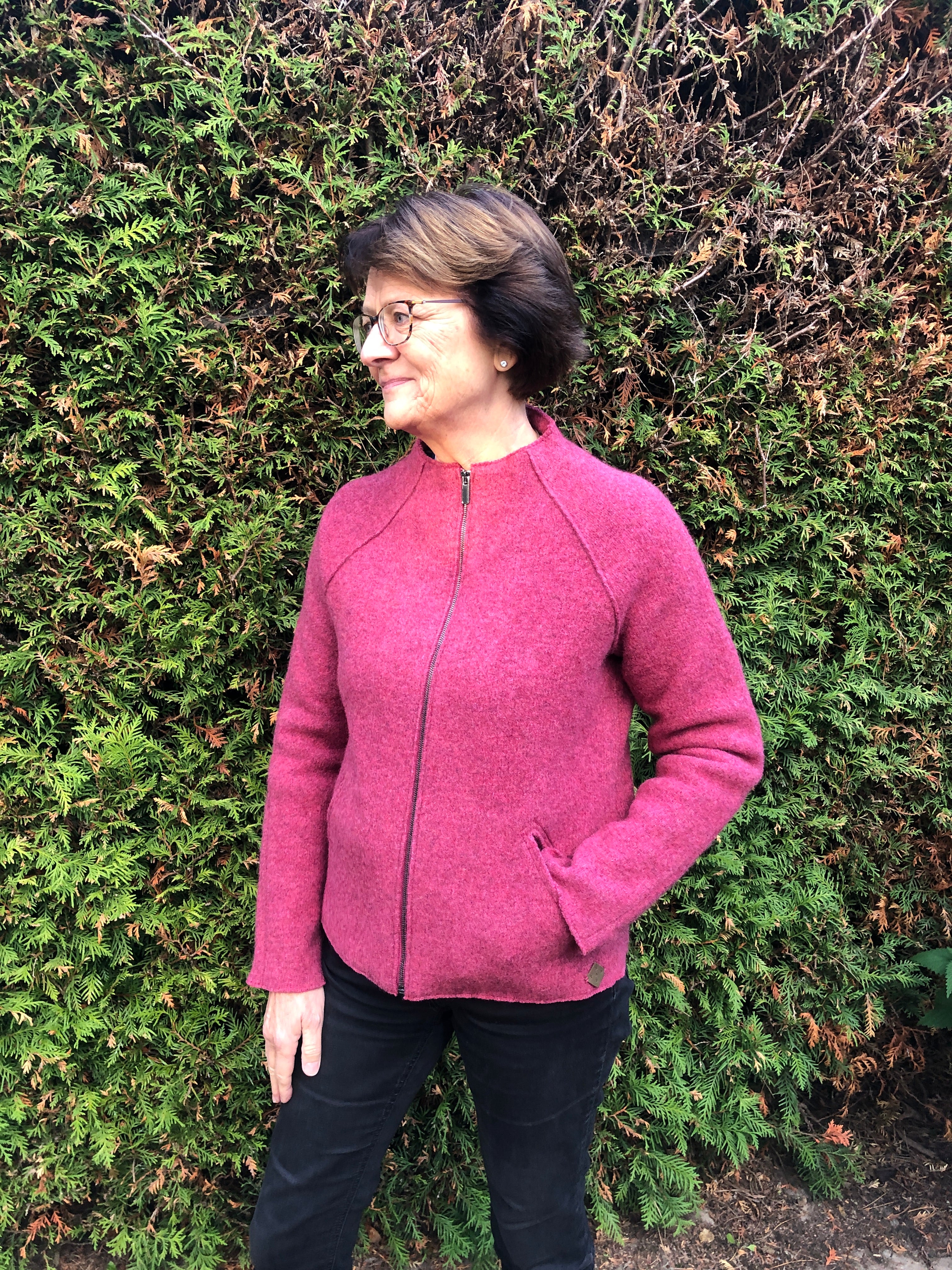 kürzere zeitlose Jacke mit Reißverschluss und Ziernähten und Eingriffstaschen aus weichem, robusten, gestricktem Wollwalk in clematis - rot von Stapf aus Österreich