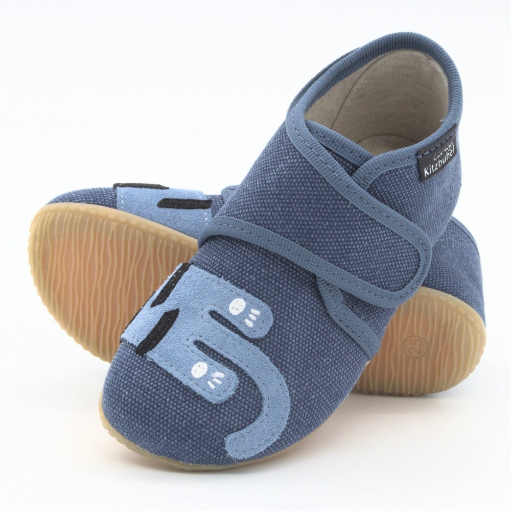 Baby- und Kinderhausschuh aus fester Baumwolle mit Klett - marineblau mit lustiger Fußballtiger-Applikation