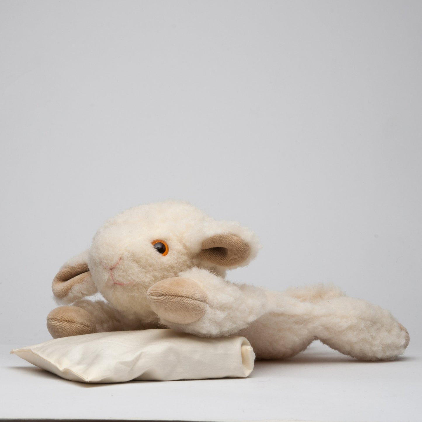 Das Kirschkernkissen kann per Klettverschluss am Bauch entnommen und separat erwärmt werden. Kirschkerne speichern Wärme sehr gut und geben sie langsamer ab als eine Wärmflasche. Zusammen mit der weichen Schafwolle ist das Lamm so der ideale Wärmespender in kühlen Nächten oder bei Bauchweh.